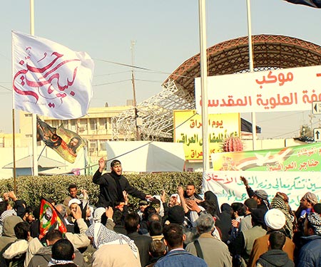 بعد از نماز صبح، دسته جمعی مجدد از همان دور زیارت وداع امیرالمؤمنین(ع) را خواندیم و راه افتادیم. مسئول هتل کاری نکرده بود و نگرانی گم کردن همدیگر در این جمعیت باقی بود. تا اول جاده که موکبها بودند، یک ساعتی راه بود و رفقا صبحانه نخورده بودند. به بهانۀ خرید صبحانه با یکی از بچهها جدا شدیم. بعد از کمی جستجو بالاخره یک پارچه فروشی پیدا کردیم و کمی بعدتر مغازۀ میلۀ پرچم را هم پیدا کردیم. دو میلۀ 4 متری خریدیم. مغازه خیاطی بسته بود، اما یک تعمیرکار کفش وسط خیابان بساطش را پهن کرده بود و ماشین دوخت هم داشت. قبول کرد کنارۀ پارچه را بدوزد.